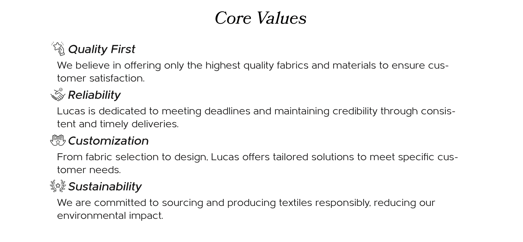 At Lucas, our mission is to deliver premium textile solutions that combine comfort, durability, and style. We aim to be the go-to supplier for uniforms, bedding, and custom textiles, while building long-lasting relationships with our clients based on trust, quality, and unmatched customer service.